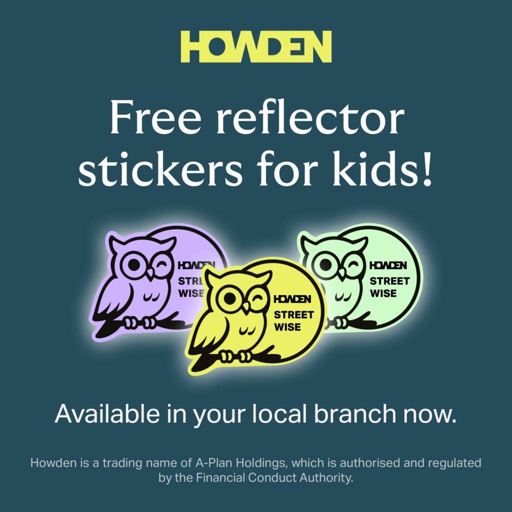 To help families stay safe this winter, Howden branches across the UK are giving away free Street Wise owl stickers. These fun, reflective companions are designed to stick onto coats, bags, or bikes – making kids more visible to drivers.