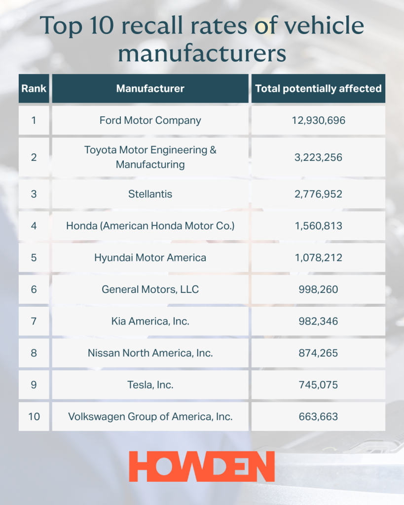 Taking the top spot is Ford, which smashed through the 10-million mark. But don’t take that to mean their vehicles are poor quality. Last year, Ford issued a record 153 safety campaigns. CEO Jim Farley says this is part of a strategy to catch issues early, even if that means more recalls now to prevent bigger problems later.